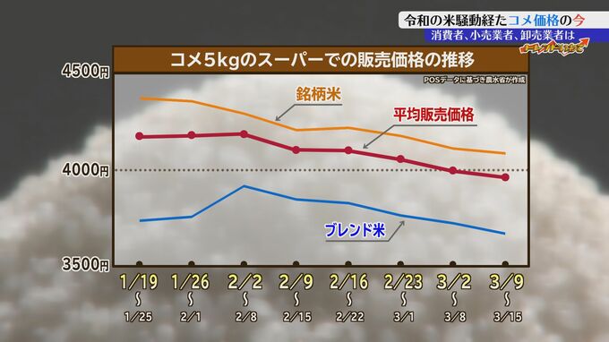 全国およそ1000店舗のスーパーの売り上げデータを基に、農水省がまとめたコメ5kg当たりの平均小売価格は、3月9日の週に税込み3980円と7か月ぶりに4000円を割り込みました。