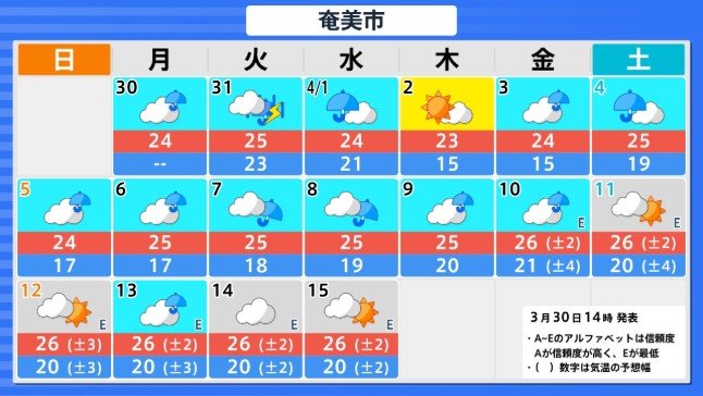 九州南部・奄美地方の向こう2週間の気温は、暖かい空気が流れ込みやすいため高い日が多く、3月31日と4月5日頃からは、かなり高くなる可能性があります。