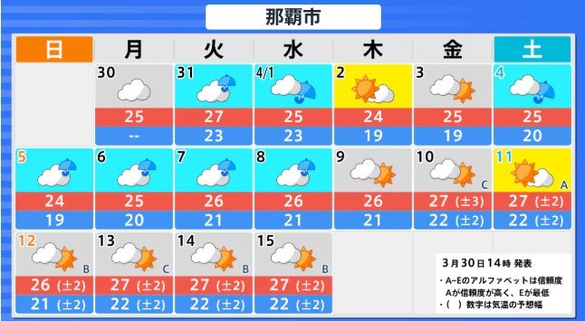 沖縄地方の向こう2週間の気温は、暖かい空気が流れ込みやすいため高い日が多く、3月31日と4月5日頃からは、かなり高くなる可能性があります。農作物の管理等に注意してください。