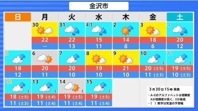 北陸地方の向こう2週間の気温は、暖かい空気が流れ込みやすいため高く、かなり高い日が多い見込みです。農作物の管理等に注意してください。積雪の多い地域ではなだれに注意してください。