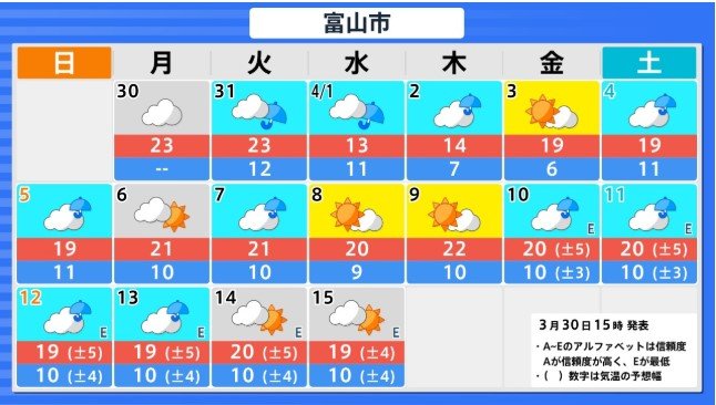 北陸地方 4月5日頃から かなりの高温