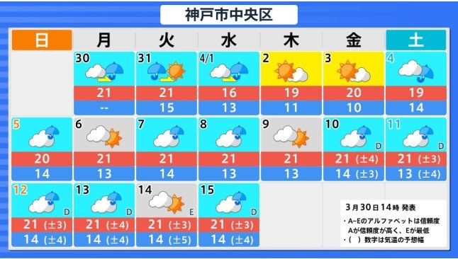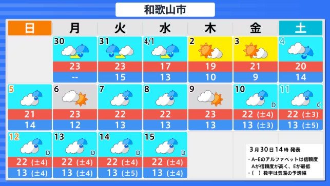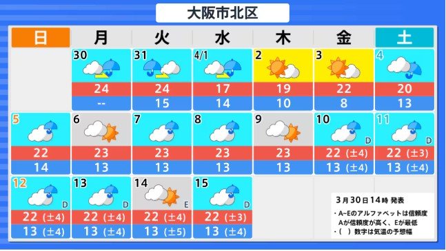 近畿地方の向こう2週間の気温は、暖かい空気が流れ込みやすいため高く、3月31日と4月5日頃からは、かなり高くなる見込みです。農作物の管理等に注意してください。