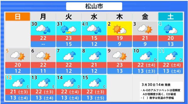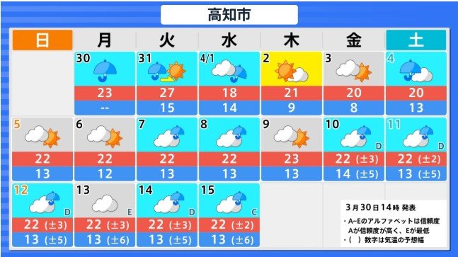 四国地方の向こう2週間の気温は、暖かい空気が流れ込みやすいため高く、3月31日と4月5日頃からは、かなり高くなる見込みです。農作物の管理等に注意してください。