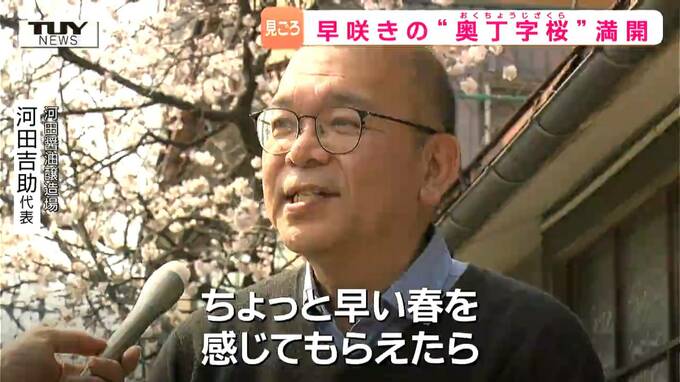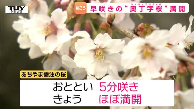 あぢやま醤油の桜は今月23日ごろに開花し、おとといは5分咲きほどでしたが、暖かい日が続いたことできょうは満開近くまで開花が進みました。