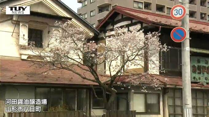山形市八日町のあぢやま醤油として知られる河田醤油醸造場です。軒先に植えられた奥丁字桜が今年も一足早く春の便りを届けてくれています。