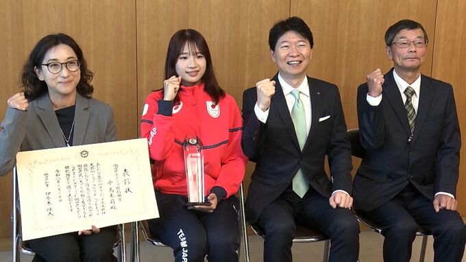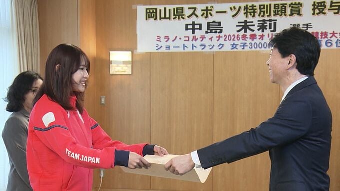 岡山県スポーツ特別顕賞は、国際大会などで活躍し県民に感動を与えた地元ゆかりのアスリートに贈られるものです。倉敷市出身の中島未莉選手は、先月(2月)、ミラノ・コルティナ五輪で日本女子のエースとして5種目に出場。このうち、女子3000mリレーで6位入賞を果たし、その功績がたたえられたものです。