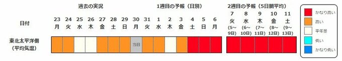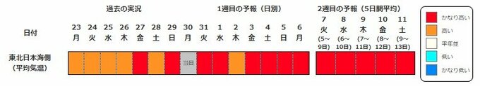 東北地方の向こう2週間の気温は、暖かい空気が流れ込みやすいため高く、かなり高い日が多い見込みです。