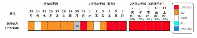 北陸地方の向こう2週間の気温は、暖かい空気が流れ込みやすいため高く、かなり高い日が多い見込みです。