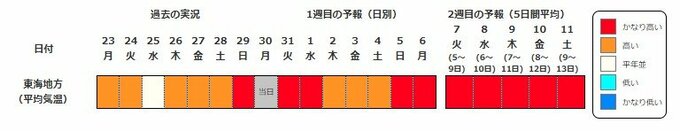 東海地方の向こう2週間の気温は、暖かい空気が流れ込みやすいため高く、かなり高い日が多い見込みです。