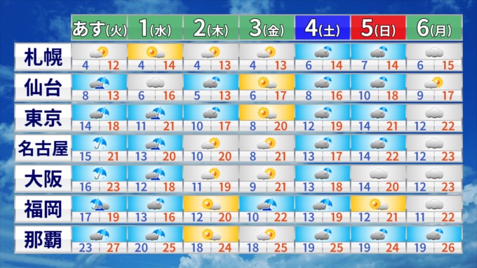 4日(土)~5日(日)は再び低気圧が本州付近を通過するため、雨が降る所が多くなるでしょう。