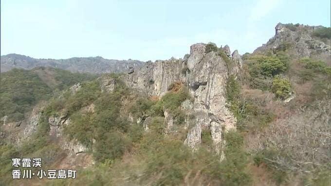 日本三大渓谷美のひとつ小豆島の寒霞渓(かんかけい)です。芽吹きの季節を迎えロープウェイからは、高くそびえる岩壁と木々の緑が楽しめます。