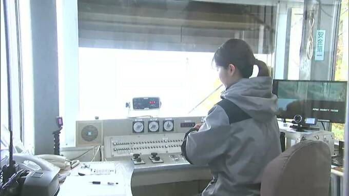寒霞渓ロープウェイで初の女性運転士となった大谷早貴さんです。今年1月に運転士としての研修をはじめ、今月(3月)、独り立ちしました。電圧や速度など様々な計器を注意深く見ながら運転しています。