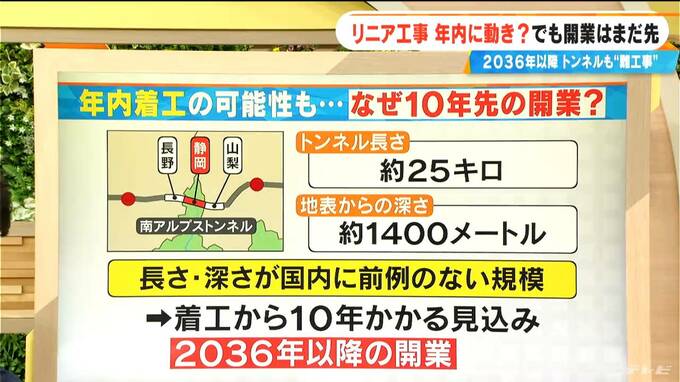 その理由は、とにかく難しいと言われる「南アルプスのトンネル工事」なんです。静岡県のほか山梨県、長野県にまたがっている、長さは約25キロ、地表からの深さ1400メートルに作るトンネルなんです。この長さ、深さが、国内に前例のない規模ということで、非常に難工事が予想され、着工から10年はかかるのではと言われています。