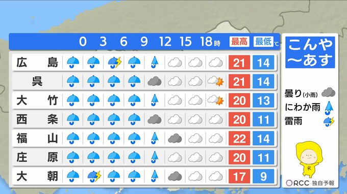 【あす3/31(火)広島天気 】大気非常に不安定 落雷・突風・急な強雨に注意 昼前にかけてまとまった雨に 中国放送 2026年3月30日(月) 18:54 国内 天気 南風吹き暖かく 日中20℃超え 雨が降り、沿岸部での朝の冷え込みはほとんどありません。朝晩も薄手の羽織り物でちょうど良いくらいでしょう。日中の気温は20℃を超えるところが多く、南風が吹いて暖かくなりそうです。