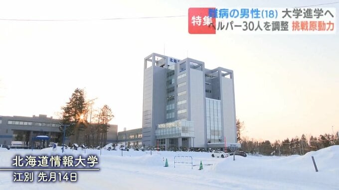 4月から通う北海道情報大学です。ヘルパーが付き添い、車椅子で大学生活を送ることができるのか実際に確認するために訪れました。