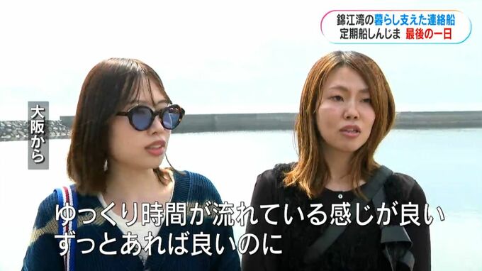 「今までありがとう」定期船しんじま最終運航 2人だけが暮らす島 唯一の定期航路廃止へ 鹿児島 南日本放送 2026年3月30日(月) 19:59 国内 最終便の出航。観光客らも集まり連絡船との別れを惜しむ 最終便の出航を迎えた新島の港。観光客らも集まり、長年親しまれた連絡船との別れを惜しみました。 (大阪から)「(運航が)最後と聞いて記念に来た。ゆっくり時間が流れている感じが良い。ずっとあれば良いのに」