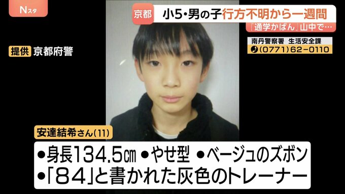京都府南丹市で小学5年生の男の子の行方が分からなくなり、きょうで1週間です。きのう、通学用の黄色のカバンが山の中で見つかりました。警察はきょうも捜索を続けています。警察などによりますと、南丹市立園部小…