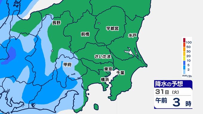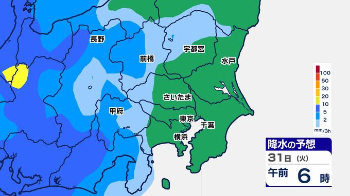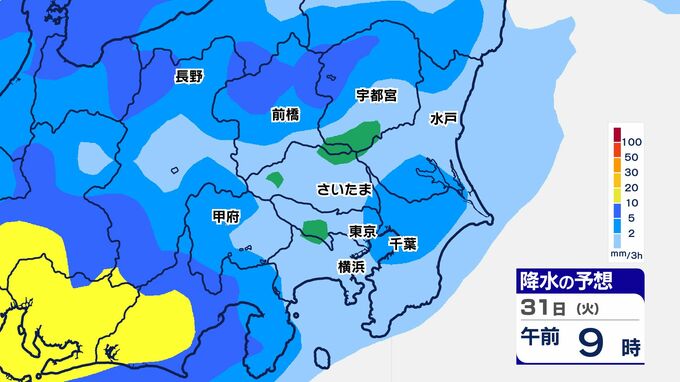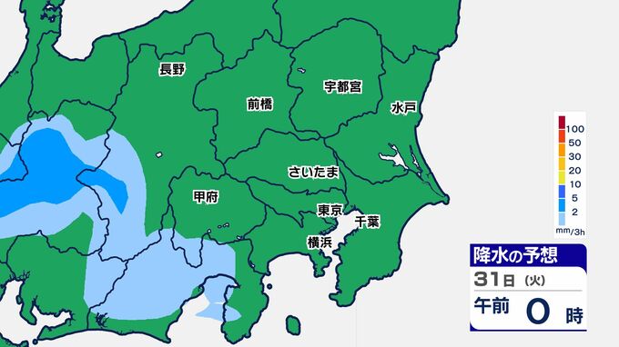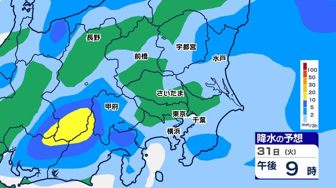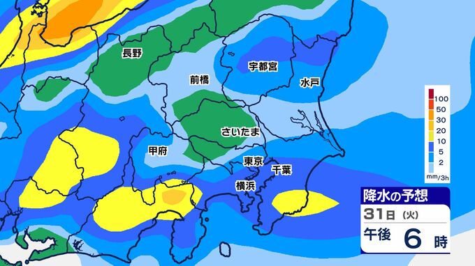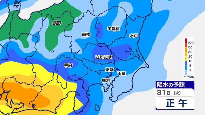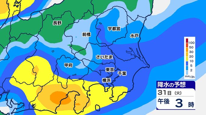 31日(火)は、関東南部でまとまった雨になり、神奈川県では大雨警報が発表される可能性があります。