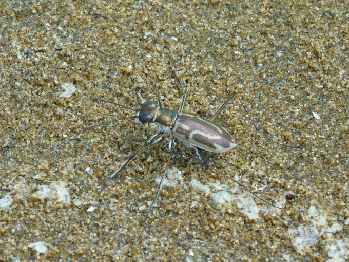 イカリモンハンミョウは体長12~15ミリで、流線型の体に細長い足が特徴です。背中に「錨(いかり)」のような紋様を持つことから、その名が付けられています。かつては金沢市から志賀町にかけての海岸に広く分布していましたが、浜への車の乗り入れ増加などで生息地が減少しました。現在の主な生息地は、羽咋市柴垣から志賀町大島にかけてのわずか2キロほどの海岸に限られています 。