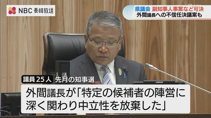 一方、先月の知事選を巡り、外間雅広議長が公平・中立であるべき立場でありながら特定の候補者の陣営に深く関わり中立性を放棄したなどとして、議員25人が不信任決議案を提出し賛成多数で同意されました。
