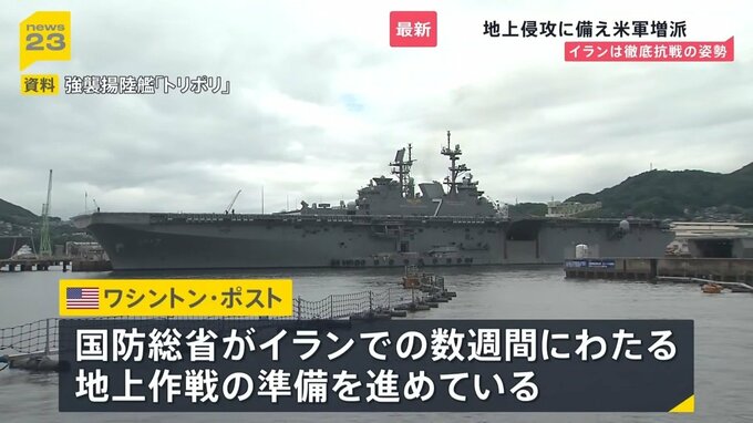 28日、長崎の佐世保基地に配備されている強襲揚陸艦「トリポリ」などが中東に到着したと発表。ワシントン・ポストは、「国防総省がイランでの数週間にわたる地上作戦の準備を進めている」と報じました。想定されているのは全面的な地上作戦ではなく、特殊部隊などによる限定的な攻撃の可能性があるとしています。