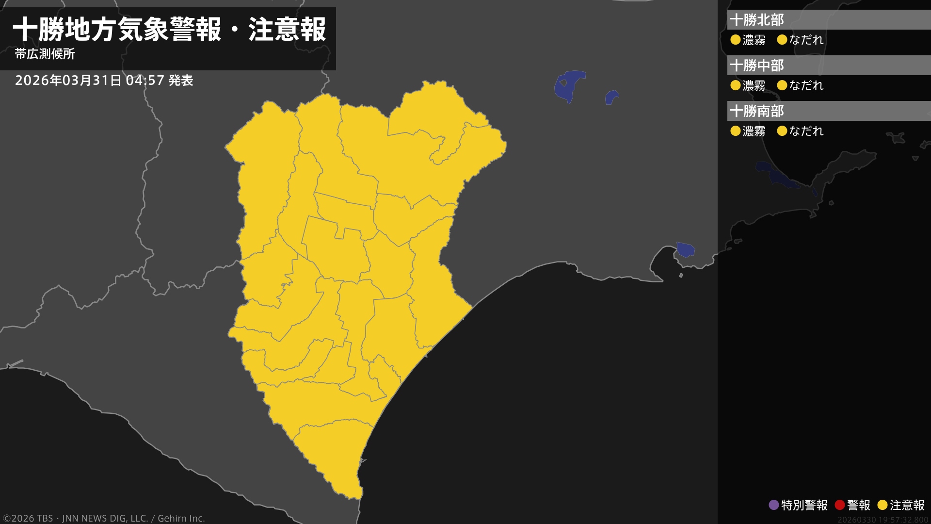 十勝地方では、31日昼前まで濃霧による視程障害に、31日までなだれに注意してください。