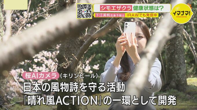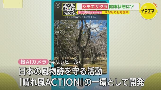 「この桜の木に愛着が湧いてきた」と語る下江予報士は、「木の健康状態が気になってきたので調べてみようと思う」とタブレット端末を取り出した。使用したのは、スマートフォンやタブレットで桜の木の写真を撮るだけで、AIが健康状態や樹齢を判定してくれる「桜AIカメラ」だ。さっそく「シモエザクラ」を撮影してみると…