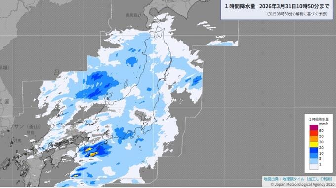 東日本はきょう午後が雨ピーク あす1日(水)は「南岸低気圧」で再び大雨警戒 気温は20℃予想も 長崎放送 2026年3月31日(火) 09:32 国内 東日本の雨ピークは? 🔶雨雲シミュレーション 雨雲の予想を見ると、関東地方では31日午後から夕方にかけてが雨のピークで、夜遅く(21時〜22時頃)には雨雲が抜け、一旦雨はやむ見込みです。