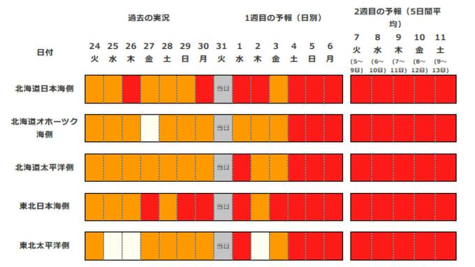 列島真っ赤…全国で10年に1度レベルの暖かさへ 4月5日頃から【早期天候情報】 長崎放送 2026年3月31日(火) 09:44 国内 北海道地方(4月5日頃から) かなりの高温の基準: 5日間平均気温平年差 +2.2℃以上 向こう2週間の気温は高く、かなり高い日が多い見込みです。農作物の管理や、積雪の多い地域ではなだれに注意してください。