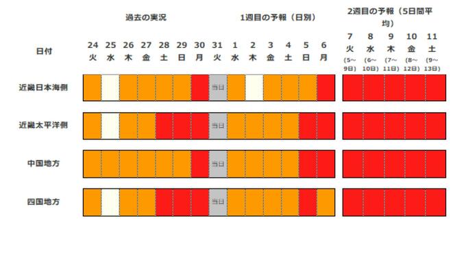 列島真っ赤…全国で10年に1度レベルの暖かさへ 4月5日頃から【早期天候情報】 長崎放送 2026年3月31日(火) 09:44 国内 近畿地方(4月5日頃から) かなりの高温の基準: 5日間平均気温平年差 +2.9℃以上 向こう2週間の気温は高く、3月31日と4月5日頃からは、かなり高くなる見込みです。農作物の管理等に注意してください。