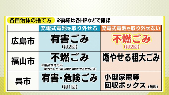 それを踏まえて3つの自治体の捨て方をまとめました。広島市の場合だと、充電式電池を取り外せる場合は「有害ごみ」。取り外せない場合は「不燃ごみ」になります。福山市・呉市と比べても、それぞれ違いがあります。人口やごみ処理施設など、ハード・ソフト両面の整備に違いがあるため、「捨て方」を一律にするには難しい背景があります。「正しい捨て方」の周知が共通の課題です。4月から変更になるのは広島市の「不燃ごみ」の出し方です。