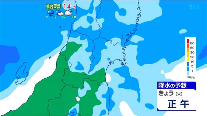 【31日宮城の天気】夕方にかけて断続的な雨 東部では強風にも注意【雨雲シミュレーション】tbc気象台 東北放送 2026年3月31日(火) 11:45 国内 天気 【雨雲シミュレーション】 昼過ぎにかけては県内各地で雨が降りやすくなります。 午後は南部(仙台以南のエリア)から先に雨が止んできそうです。 【31日午前9時から午後11時までの雨雲シミュレーション】 一方、県北や西部では夜まで雨が降る所もありますが、日付が変わる頃には止むでしょう。