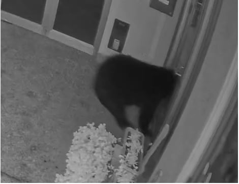 1頭のクマが小学校の入り口のガラスに近づきます。