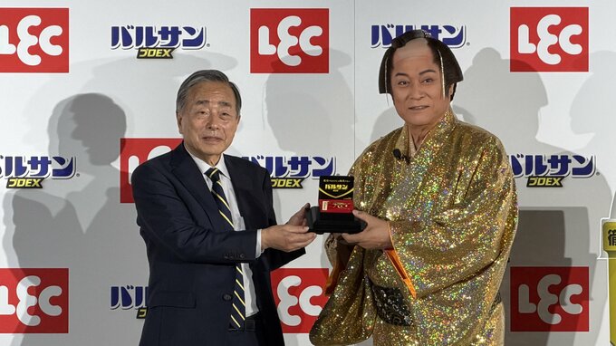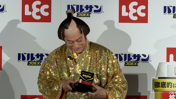 抽選で5人に純金製ゴキブリ(50グラム)が当たる「金のバルサンキャンペーン」の開催を記念し、青木社長から特別に松平さんへ100万円相当の〝金のゴキブリ〟が贈られると、「おおおお」「すごいですね」「ふふふ」とニコニコ嬉しそうな表情を浮かべました。