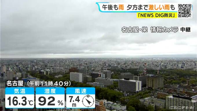 名古屋市内は朝から雨が降り、正午前も厚い雲に覆われています。気温は16.3℃で、風が強まっています。