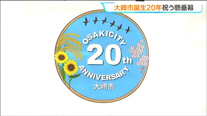 旧古川市など、1市6町が合併して誕生した、宮城県大崎市の20周年を記念した懸垂幕が31日朝、市役所でお披露目されました。
