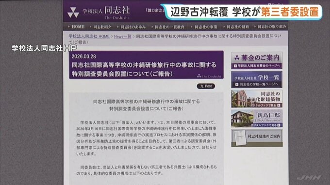 今月16日、沖縄県名護市の辺野古沖で、同志社国際高校の生徒らが乗る船2隻が転覆し、女子生徒(17)と船長(71)の2人が死亡しました。事故を受けて高校を運営する学校法人同志社は、今月28日付けで第三者による調…