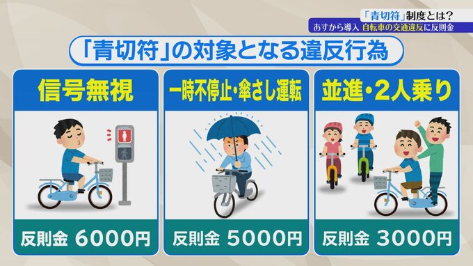 4月から導入 自転車の交通違反に対して反則金を科す「青切符」制度 どんな行為が違反?最も反則金が高いのは? 岩手 IBC岩手放送 2026年3月31日(火) 16:57 国内 いわゆる「青切符」制度と呼ばれ、高校生を含む16歳以上が対象で、113の違反行為に対して、3000円から1万2000円の反則金が定められています。 一部の違反行為・反則金は、信号無視が6000円、一時不停止・傘さし運転が5000円、並進・2人乗りが3000円などとなっています。