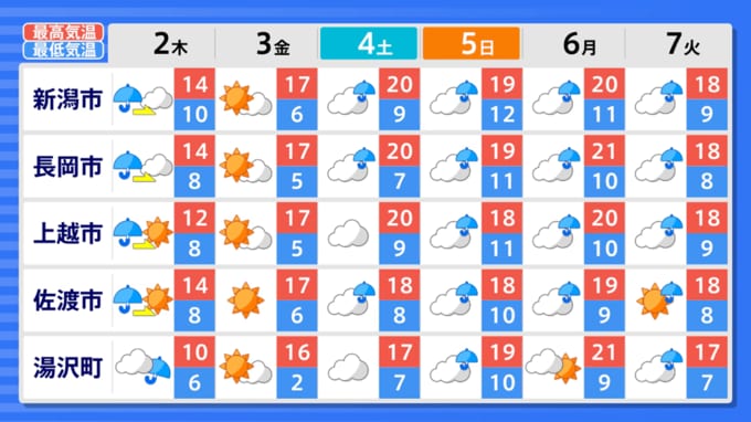 桜『ソメイヨシノ』新潟市で平年より8日早く“開花宣言”も 前線を伴った低気圧で天気のすぐれない4月のはじめ【全国の週間天気予報図も掲載】 新潟放送 2026年3月31日(火) 14:46 国内 天気 新潟県の今後の天気 新潟県内の天気予報(4月1日) 新潟県も4月3日以外は雨や曇りの天気が続きそうですが、6日には長岡や湯沢で21℃の最高気温が予想されています。 新潟県内の週間天気予報(4月2~7日)