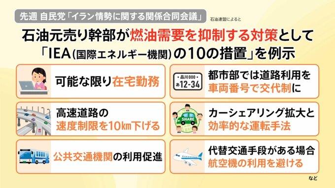 石油連盟によると24日、自民党の「イラン情勢に関する関係合同会議」で、石油元売り幹部が燃油需要を抑制する対策として、「IEA(国際エネルギー機関)の10の措置」を例示したということです。