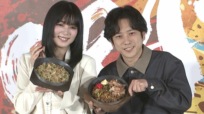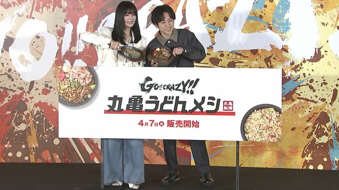嵐の二宮和也さん、池田エライザさんが丸亀製麺新商品発表会に登壇しました。
