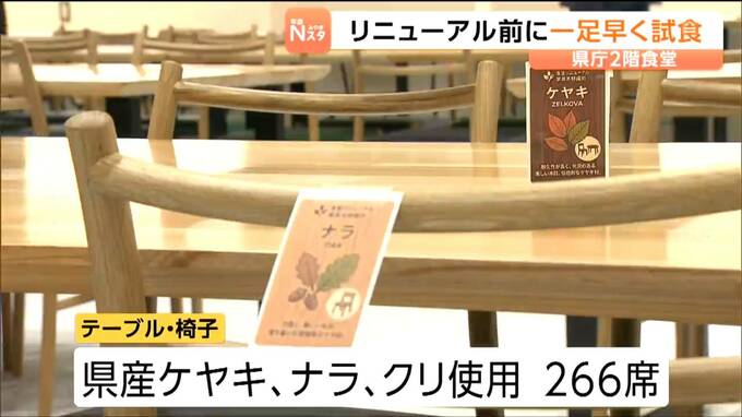 食堂は2025年4月から休業していましたが、約2億8000万円をかけてリニューアルされ、4月1日オープンします。テーブルや椅子には県産のケヤキやナラ、クリが使われていて、席数は266席です。