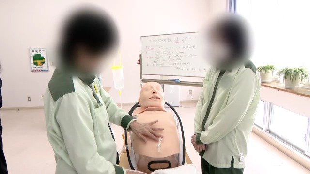 刑務所内での介護福祉士の研修の様子。修了後3年の実務経験を経て、国家試験を受けられます。
