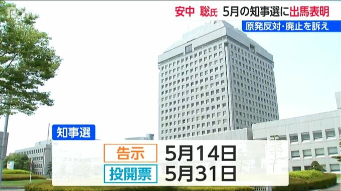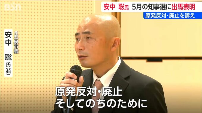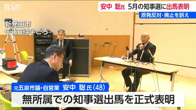 元五泉市議の自営業 安中聡さん48歳が31日、5月の知事選に無所属で出馬することを正式に表明しました。