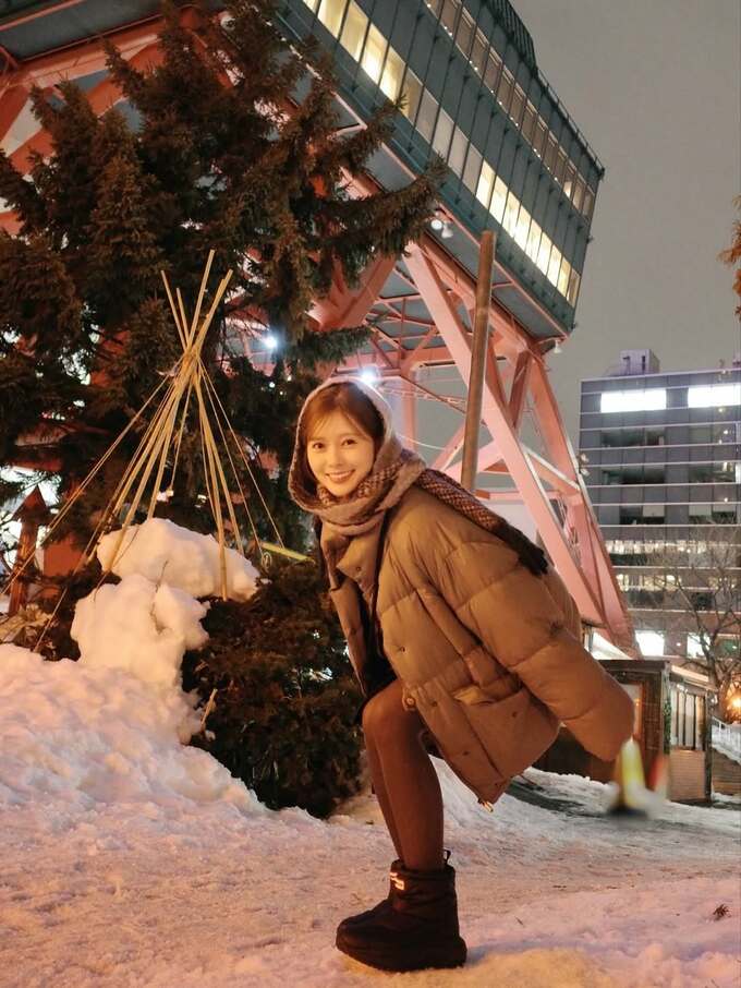 白石さんは「冬!」という一言コメントとともに、北海道札幌市のシンボルである「さっぽろテレビ塔」の夜の雪景色を背景にした2枚の画像を投稿しました。