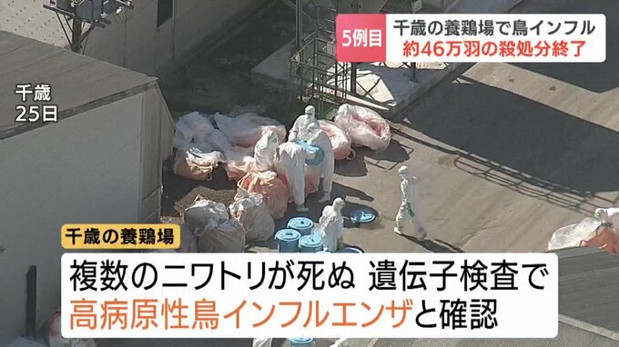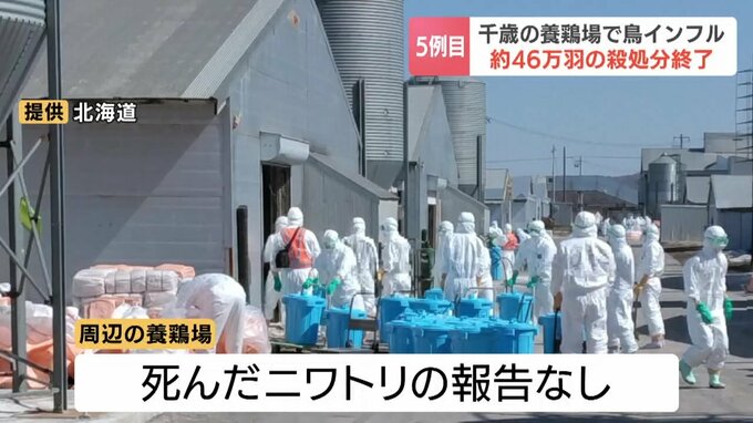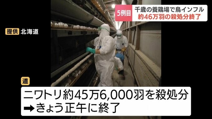 北海道内で今シーズン5例目となる千歳市の養鶏場で発生した高病原性鳥インフルエンザについて、北海道は飼育されていたニワトリ、約46万羽の殺処分が終了したと発表しました。