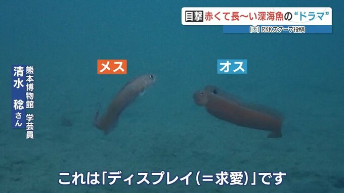 熊本博物館 学芸員 清水稔さん「・・・ここ!おそらく右がオスで左がメス。これはディスプレイ=求愛です。いま求愛しているのだと思います」