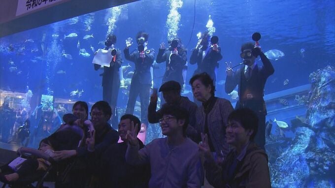 約3000匹の魚たちが泳ぐ水槽に現れたのは、きょう入社した5人の新人。これは、三重県の鳥羽水族館の入社式で、記念になるようにと飼育員から提案され、ことしで19回目を迎えます。