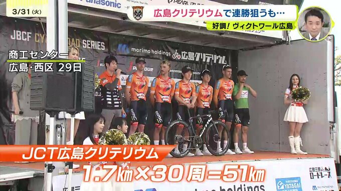 日曜日の広島クリテリウムは商工センターを舞台に1・7キロのコースを30周=51キロで争う高速レースです。ランキングトップの証、緑色のジャージを着た孫崎キャプテン。この日はクリテリウムに強い中村圭佑がメンバー入り。