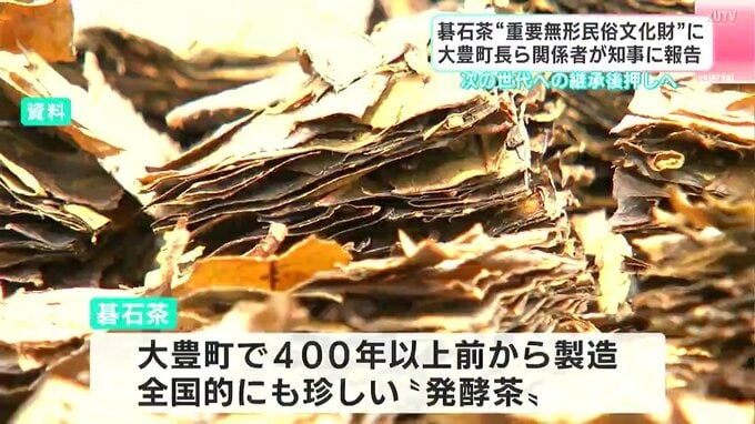 31日は大豊町の下村賢彦町長をはじめ関係者が県庁を訪れ、“国のお墨付き”を得た自慢の碁石茶の味や形の特徴を知事に説明しました。一時期は1軒の生産者でつないできた碁石茶の伝統製法。今回の指定で「これらを守り続けることが自分たちの使命だと再認識した」という声を受け、濵田知事は次の世代への継承を後押ししたい考えを示しました。